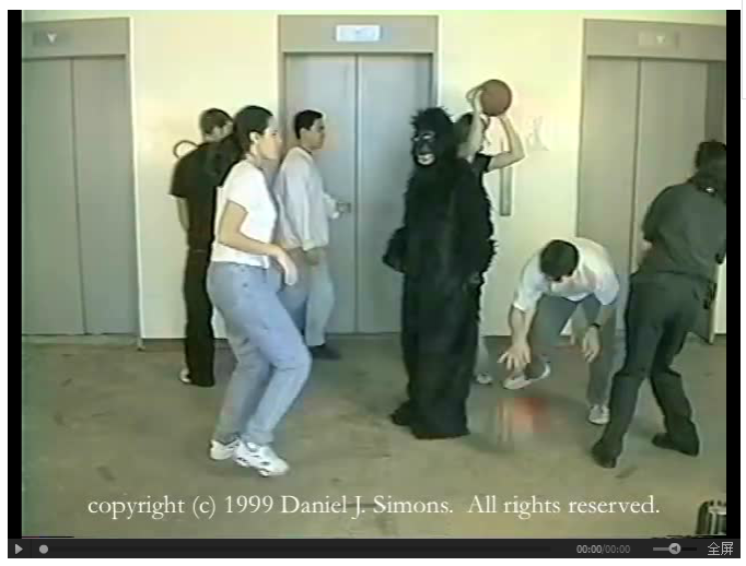 如果你刚刚真的全神贯注在计数的话,可能不会发现,视频中有一个大猩猩的扮演者大摇大摆穿过了传球队伍。(是的,实验的重点并不真的是传球次数 )