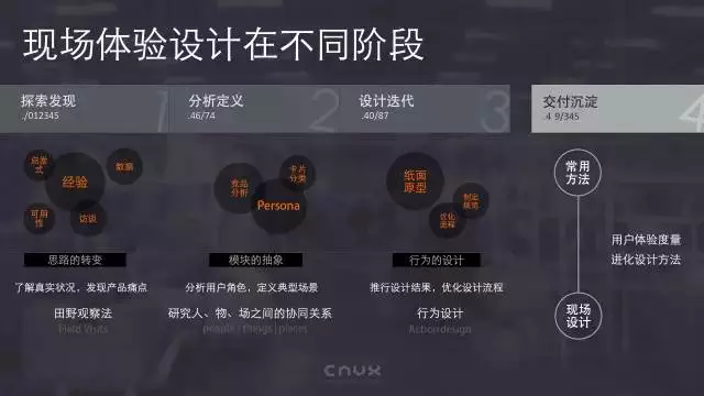 小结:现场体验设计在4D的不同阶段都扮演了不同的角色。Discover探索发现阶段,主要是通过Fields Visits,了解真实状况,发现产品痛点。Define阶段,是分析用户角色,定义典型场景,研究人、物、场、之间的协同关系。在设计迭代过程(Design),我们聚焦于行为的设计,而非单纯界面上的改进。在交付沉淀(Deliver),结合用户体验度量的方法,深入现场进行设计,最终交付已不仅是成熟,而且也是愉悦使用体验的产品。