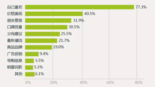 二、在日常购物时,77.3%的90后会注重自己是否喜欢, 40.5%会关注价格高低,31.9%会受到朋友推荐的影响。