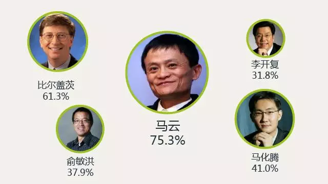 五、54.9%的90后崇拜商界精英,领袖伟人紧随其后为31.2%。在商界精英中,马云威望最高,为75.3%,比尔盖茨61.3%,马化腾41.0%。