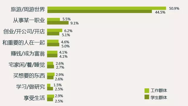 六、90后最渴望的事情是旅行,其中旅行愿望最为迫切的是工作中的90后,达50.9%,学生群体外出旅行的愿望为44.5%。