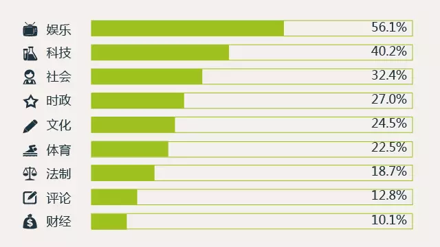 八、高达56.1%的 90后青年群体会关注娱乐新闻,在各新闻领域中占比最高。99.1%的90后会关注多媒体,81.9%会关注社交媒体,71.5%会关注游戏。