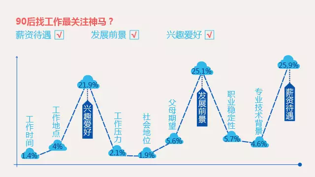 十三、90后中,有83.5%的人表示不在乎加班。在找工作时,90后对工作时间关注度仅为1.4%,对社会地位的关注度仅为1.9%,位列前三的影响因素依次为:薪资待遇、发展前景、兴趣爱好。