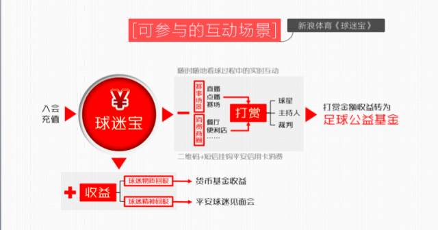 现在互联网支付和手机支付已经成为很多年轻用户经常使用的服务,新浪把内容场景和消费场景做了结合,跟平安基金推出了一个叫“球迷宝”的产品,用户观看直播的过程当中,可以直接打赏球员,通过移动端支付,存放在球迷宝中,在这个产品打赏之后,剩余的费用将会自动变成平安基金理财产品的一部分,给予投资者直接的回报,搭建这样的一种从阅读到购买的场景。