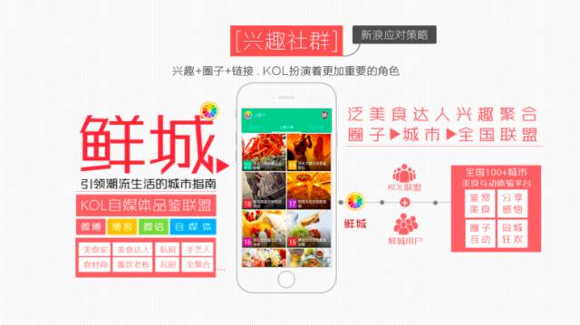 如”鲜城”。“鲜城”背后,70%内容来自自媒体的创作,大量提供内容的人可能就是身边的一个美食爱好者,或者是一个厨师。这些人就是这个圈子的KOL,借着移动互联网时代自媒体的便捷性,把他们自己的观点和内容分享上来之后吸引更多人的关注。