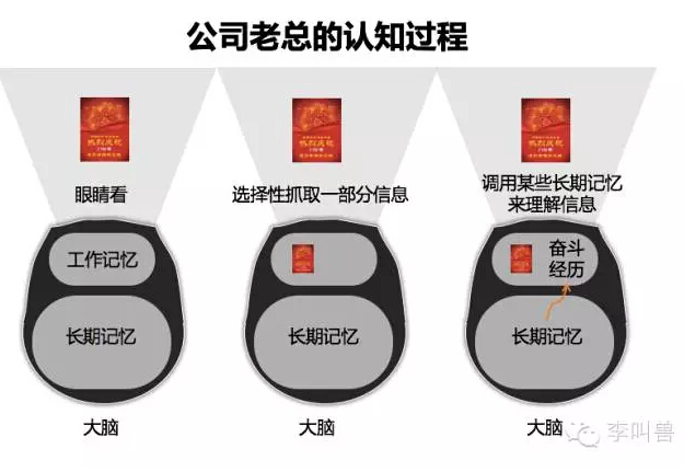 不同人的大脑记忆不同,这就导致看到信息后选择调取的记忆不同。比如公司老总看到该海报时,调取记忆的过程可能是这样的: