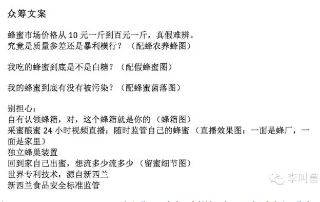 比如在【李叫兽研究会】中,有一期给学员布置的作业是为一个高端蜂蜜创业公司写众筹文案,结果看到有一个学员开头是这样写的: