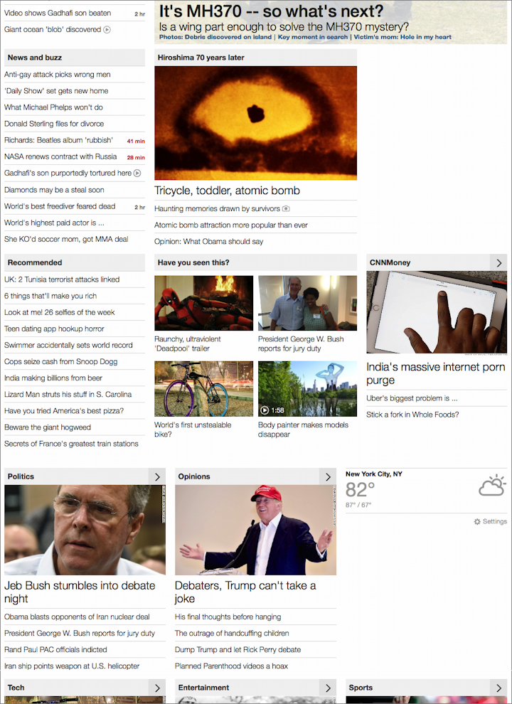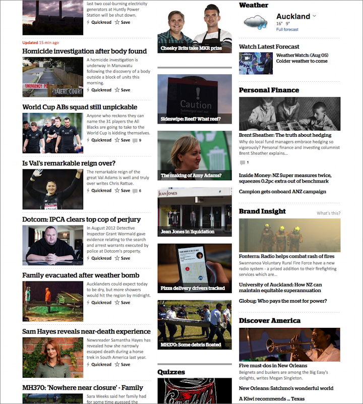 NZ Herald采用了一个彼此之间互不关联的灵活垂直布局。这种报纸一般的布局遇到即便字数和图片都各异的内容也能从容应对。