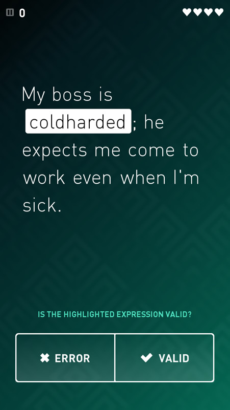 上图所示的Elevate,在它的游戏式学习界面中运用了所有这些要素。用户必须触摸屏幕以回答问题、修正答案,而漂亮的动画则用来取悦用户。这款APP是让用户用来锻炼思维的(图片中的游戏是用来教会你语法和用法的)。用户可以和朋友或其他APP用户分享分数和结果。