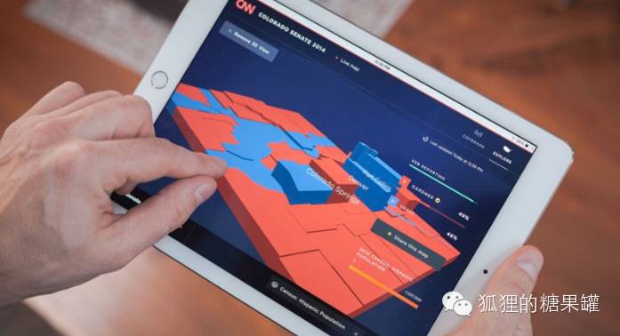 最后, 来自我们过去在CNN的一个项目,我们使用颜色编码显示政党偏好,用3D高度效果同时形象话人口统计的信息。