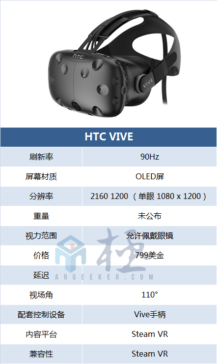 看完了国内VR头盔的基本参数,我们再来了解下国际领先水平的VR头盔情况。目前国际上公认体验最好的VR头盔,是Oculus Rift、HTC Vive和SONY PSVR。因为SONY PSVR是与主机连接,不具有可比性,因此我们列举了余下两款设备信息进行对比。
