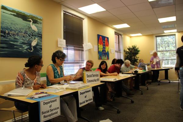 (找来Stanford别家NGO的义工还有我们VIA的领队充当“政府部门”,由于场地原因,这个Poverty Simulation不是在D.School里面做的,我们借用了校园里隔壁一栋楼的Seminar Room)