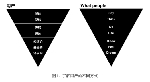 探索用户的想法和他们已知的东西,能让我们了解他们自己主观认知的体验。了解用户的感觉赋予我们与他们共情的能力。这能让我们知道很多关于用户的隐性知识(Tacit knowledge)。比如,那些他们说不出来的感觉(请参考文献Polanyi,1983)。通过挖掘理解用户的渴求,我们能感知他们的美好愿景。这是另一种形式的隐性知识,可以揭示一些潜在的需求(Latent needs)(比如,那些未来才会被识别的需求)。例如,互联网的出现和使用其实体现了很多之前潜在的交流需求。