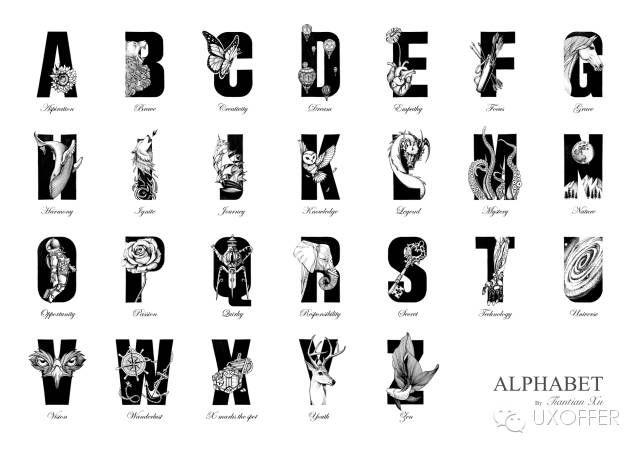 在这个挑战中,我按照字母表顺序,每天选择一个以当日字母打头的单词,用图案与字母结合的形式表达出其主题。