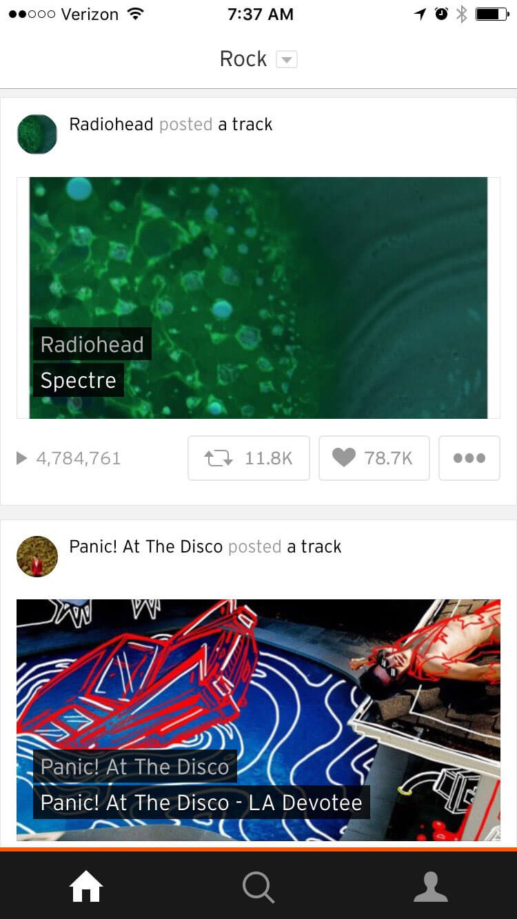 所以,你可以让一个卡片播放视频,紧接着的卡片则链接到另外一个应用,而下方的卡片则直接放置了一段长长的文字。卡片式设计在移动端上的另外一个优 势就是非常的易用,尤其是在有APP之内。绝大多数的应用会在一个屏幕内承载两个卡片,就像 SoundCloud 这样,又或者一屏就是一个卡片,这样一来,即使用户的手指再粗也不会错过任何内容!