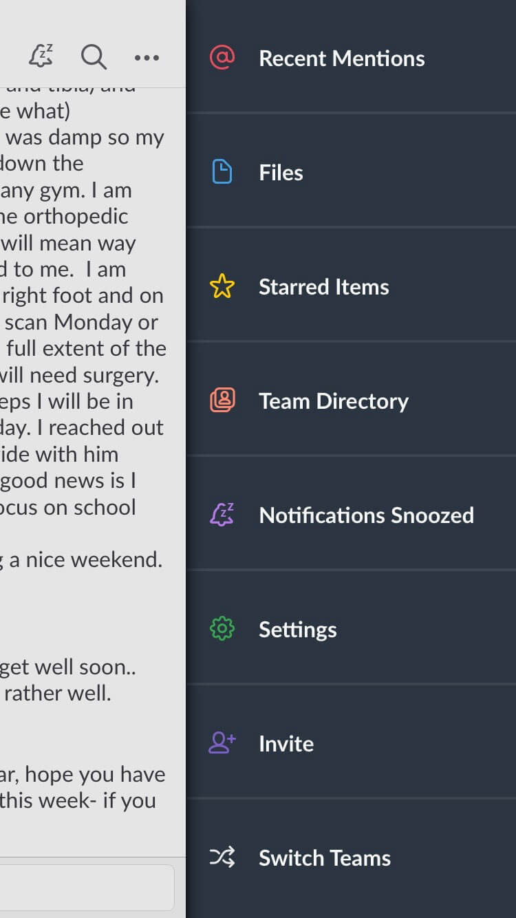 Slack 绝对是导航菜单设计中的典范,它的菜单可以从屏幕的左右两边弹出显示,而主要功能菜单是从右侧弹出的,而特定频道的菜单则是从左侧弹出。