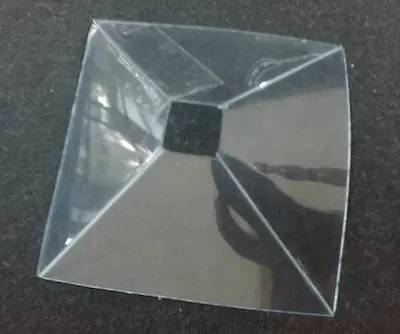 将剪下的塑料板折叠成图中的样子,用胶带粘住连接处。完成品应该看起来像个倒立的金字塔。注意下边的开口要整齐且不要太大,“金字塔”能够放置在水平面上就可以。