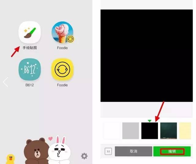 在主界面中点击“手绘贴图”,然后选择黑色背景,点击“编辑”。在接下来的界面中,点击“剪切”,选择刚刚拍摄的照片。分别将4张照片剪切在黑色背景中,注意顺序。