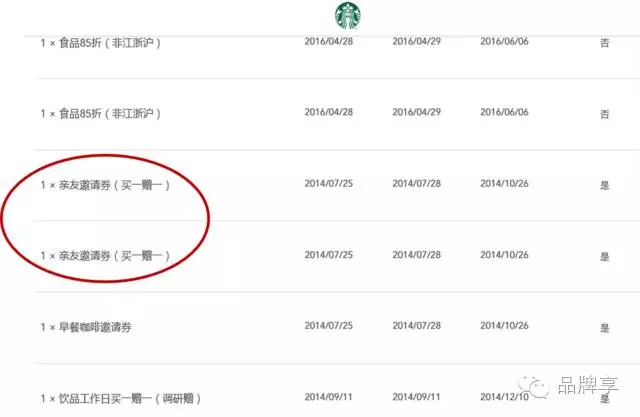 星享卡中经常会出现买三赠一、买二赠一、买一赠一的优惠券,乍看起来很优惠,其实并没有多大用处,没有多少人会一次性买那么多咖啡。这些券的真正意图是:让顾客带朋友来、或者买回去赠送朋友。这样就把星巴克传递给更多的人,让星巴克的社交媒介的形象更深。