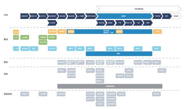 1.服务蓝图不仅包括横向的客户服务过程,还包括纵向的内部协作,是描绘整个服务前、中、后台构成的全景图。