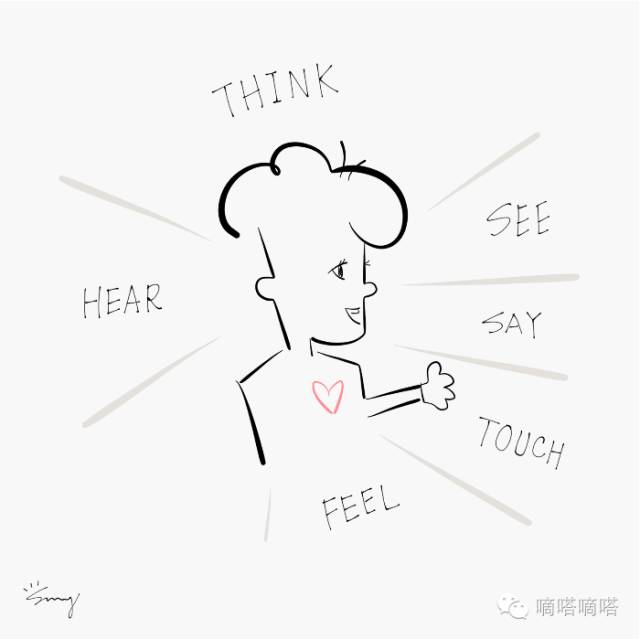 跟没接触过设计的或者刚接触设计的人,要纠正设计跟视觉的直接联系这个误区。我觉得,体验是各种感知在时间上的集合,看到的,说出的,摸到的,感觉到的,听到的,想到的。如下图: