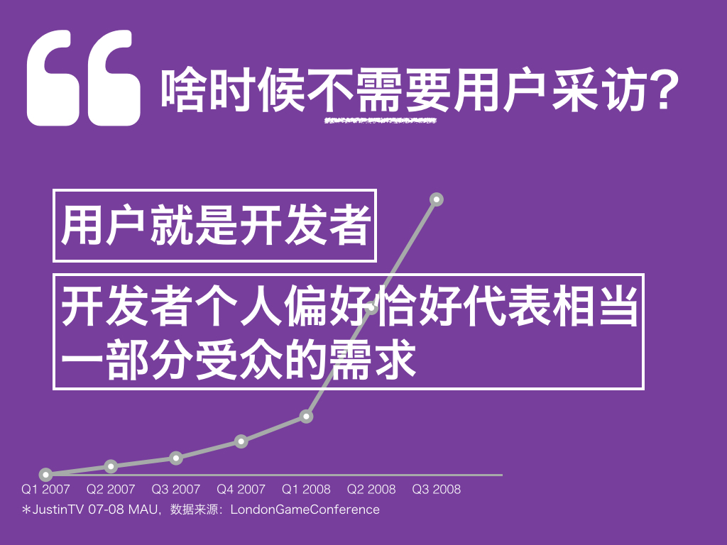我们首先来看看什么情况下你可以不需要用户调研和采访。Emmett 最被人熟知的产品是 JustinTV, 这是一个 24 小时播放真人秀的视屏网站,网站最初只有一个直播频道,播出另一创始人 Justin Kan 的生活,并实时发布在网站上。网站后来衍生为多用户生产内容 (UGC) 的视频网站。于是开发者就成为了内容生产者,也成为了产品的终端使用者。无疑,在这种情况下,你可以大胆地跳过用户调研 —— 问问自己需要什么,做出来,修改,直到自己满意就好。JustinTV 就是这么做起来的,甚至在一段时间的发展以后,增长非常不错。团队自己的偏好代表了一众其他用户的需求:他们也喜欢这种 24 小时直播自己的服务。