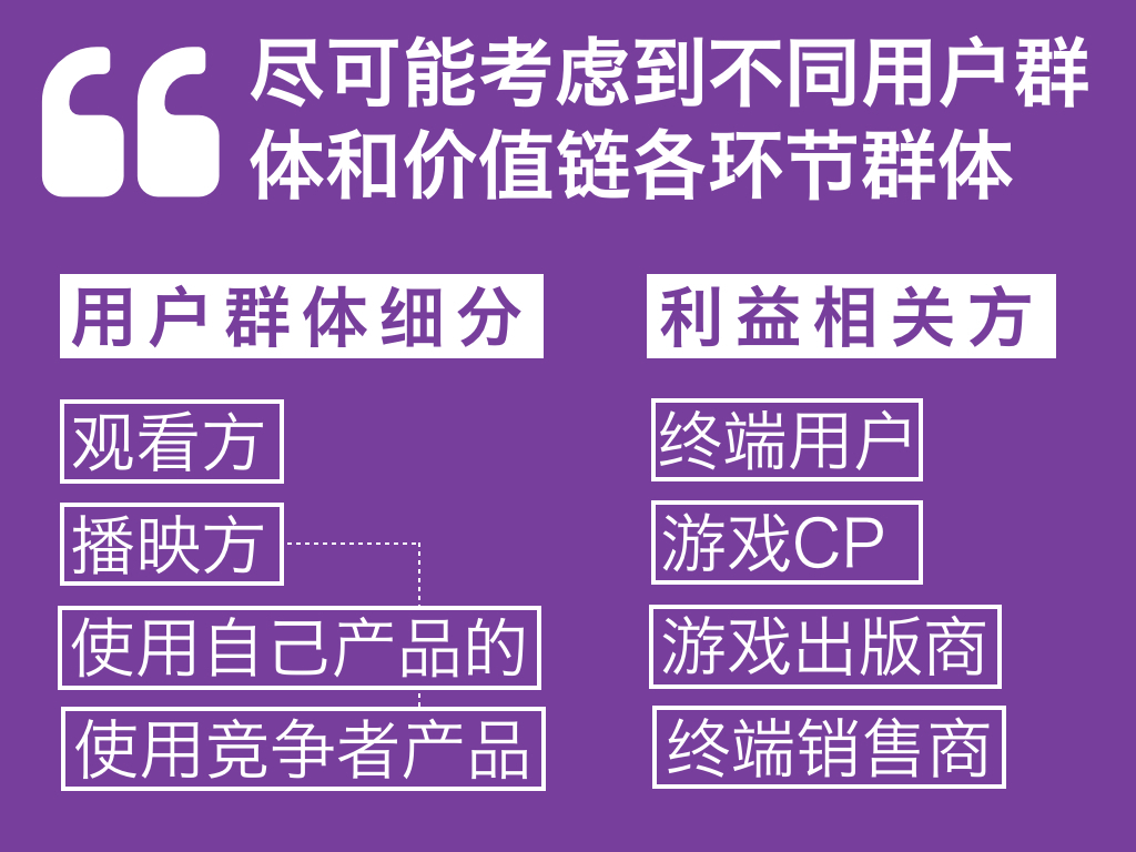 JustinTV 于是通过用户调研证明了内容创作 / 播映方是至关重要的,他们决定者内容的质量,而内容的质量会带动观影方。然后再通过集中调研内容创作群体确定了平台如何优化针对这一群体的服务和功能。在用户的细分里面他们找了大、中、小型内容制作 / 播映方,已经使用了 JustinTV 的内容制作 / 播映方,同时用过 JustinTV 和竞争对手的内容制作 / 播映方,和只用过竞争对手产品的内容制作 / 播映方。在利益相关方方面,他们找到直播工具开发商,电竞游戏 CP,经销商,终端提供商等等。