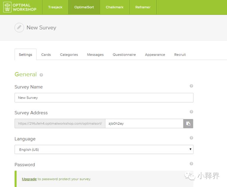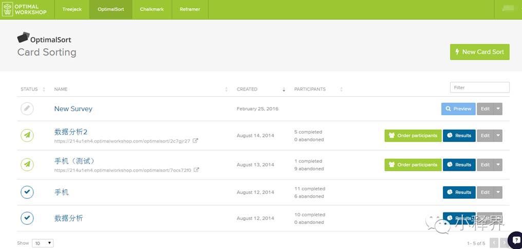 采用OptimalSort软件,依次填写Settings、Sards(免费版本中卡片限制在30张以内,数据分析只能看10个用户数据)、Categories,然后分别点击右上角Save和Launch,将Survey Address发送给用户,即可进行卡片分类。该软件适用于开放、闭合、混合式(即开放+闭合)三种形式的卡片分类数据分析。