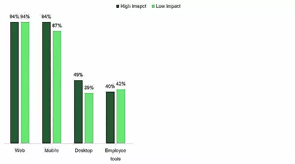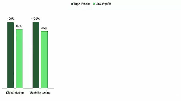 如同预期,不论高或低影响力的团队,都做了许多数字设计(Digital design)与可用性测试(Usability testing)。