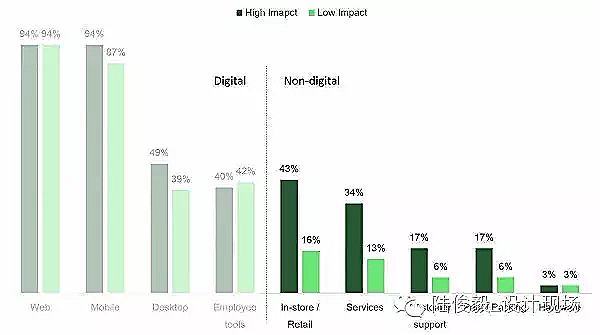 然而,差异开始浮现。许多线下的产品,如实体店、服务、客户支持等,主要只有高影响力的 UX 团队在做。这中间似乎有一条数字分界──许多组织仍认为 UX 只是适用于在线的产品。