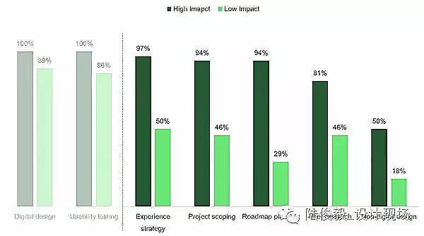然而,自觉有高影响力的 UX 团队明显比低影响力的团队做更多策略性的工作,如体验策略(Experiencestrategy)、产品规范(Product scoping)、Roadmap 规划(Roadmapplanning)等。这些是 UX 应该参与但大多没有机会进行的活动。