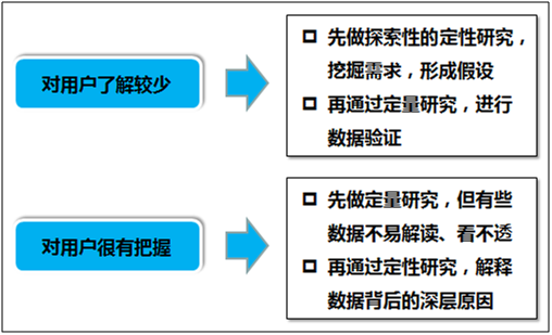 如果是对于目标市场与用户知之甚少,就要先做大量的定性研究,如市场走访调研、用户深访、入户观察和深访、焦点小组座谈会等,一方面先扫描普遍性现状,对市场和用户有个基本的认知,了解市场和用户有哪些问题;另一方面是做深入性的探索,挖掘这些现状与问题背后的具体原因是怎样的,以及市场和用户的具体需求点有哪些。这样经过定性研究,就可以形成基本的研究问题假设,再通过定量研究,进行数据验证。这种研究套路尤其适合对新进入市场的研究,千万不要一上来就做定量问卷,否则研究员连问卷问什么问题、如何问问题、如何设置问题选项都不知道,因为这些都是靠定性研究直接获取、以及分析后假设得来的。