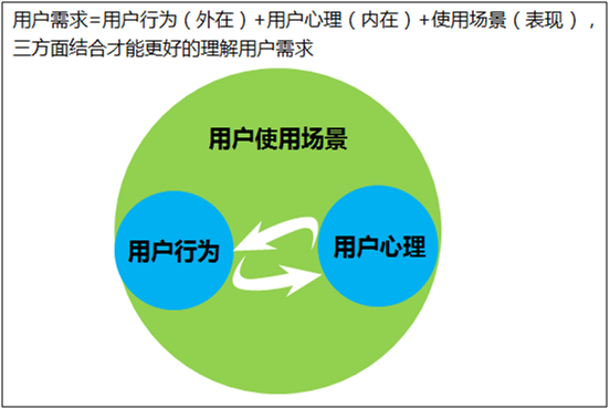 那么一个大问题来了,我们老是在讲“用户需求洞察”的重要性,那么究竟如何洞察用户和用户需求呢?我在进修MBA课程时,在组织行为学课程里看到一个非常好的分析方法,我把它借鉴过来做了一些改良,形成了如下这套用户需求洞察的方法。它的核心理念是:一个人(用户)的行为是心理的外在表现,而心理是行为的内在依据,而这些行为和心理是可以在特定场景中观察与洞察到的,因此只要回归真实的用户场景中,观察用户的行为,洞察用户的心理,就能分析出用户的真实需求,并且场景+行为+心理这三方面结合起来才能更好的理解用户需求!