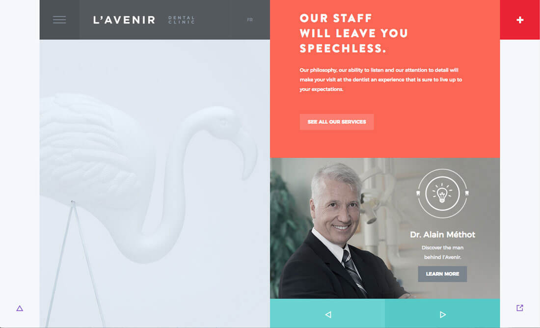 以上面的牙医诊所的网站为例,整体的设计就颇为有趣,亲切,且充满活力。网页中的人物角色旁边的灯泡图标中,就加入了牙齿的元素,非常点题。网页左右侧的色彩对比也平衡了整体视觉,左侧偏白的部分和白色的图标相互呼应。网页其他的地方也合理地运用小图标来强化视觉。