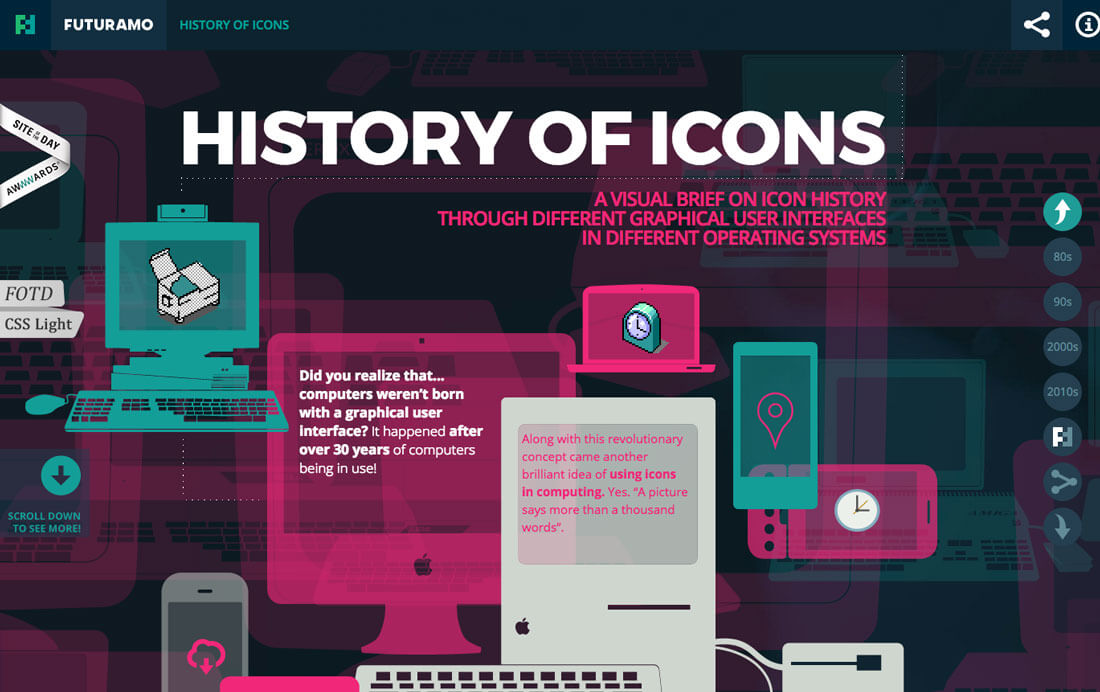 而上面这个关于图标历史的网站就展示了多年来图标风格的演变,这个网站本身研究的内容就已经很酷了,更别说其中所承载的风格多样的图标了。这些图标所呈现出来的风格、色彩、使用方法和规格都非常值得研究学习。