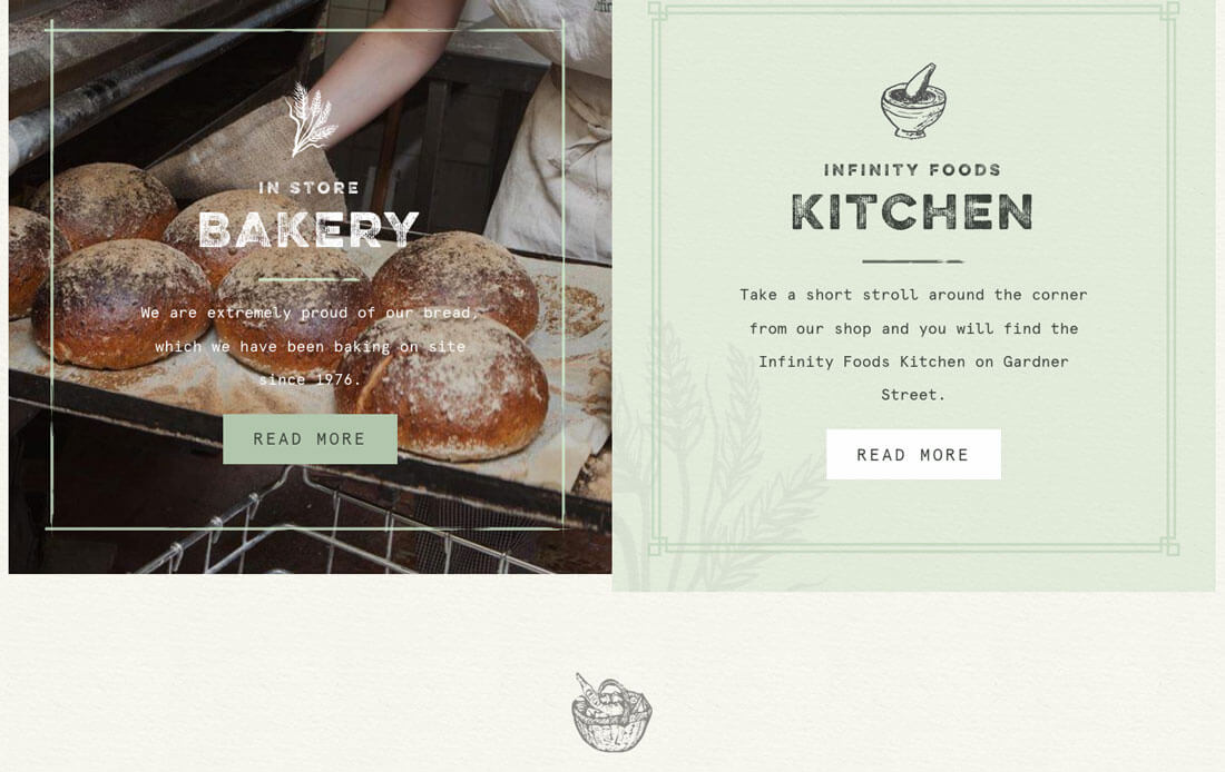 所以,你可以参考 Infinity Foods 的设计。你可以打开他们的网站,看看他们全套的图标都是怎么设计的,这种个人风格浓郁的设计,本身就足以营造出区别于同行的特色。