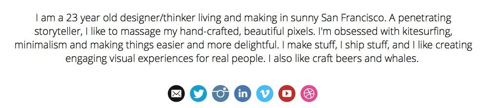 在你的个人网站我没有看到任何作品,但是这个段落你告诉我,你是一个创造者,思想家,作家和一个故事大师。非常令人印象深刻!你一定喜欢冒险。你作品集下方放置了10个社交链接,能让我点来点去,花掉一天的时间。