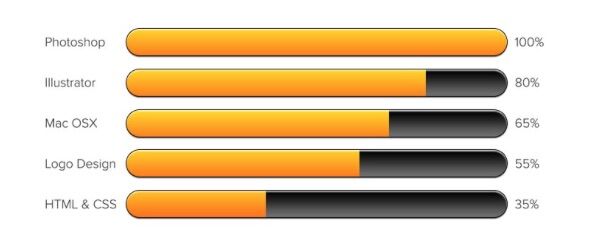 技能图表最近是一个广泛的趋势,在很多设计的作品集中都有出现过:列出技能,用条形图的方式表示自己对每项技能的熟练程度。其实这些图表都是无用的。数值范围是什么呢?你懂55%的logo design?这意味着什么呢?Adobe Illustrator 80%? 我是应该表示担忧呢,还是喜出望外呢?