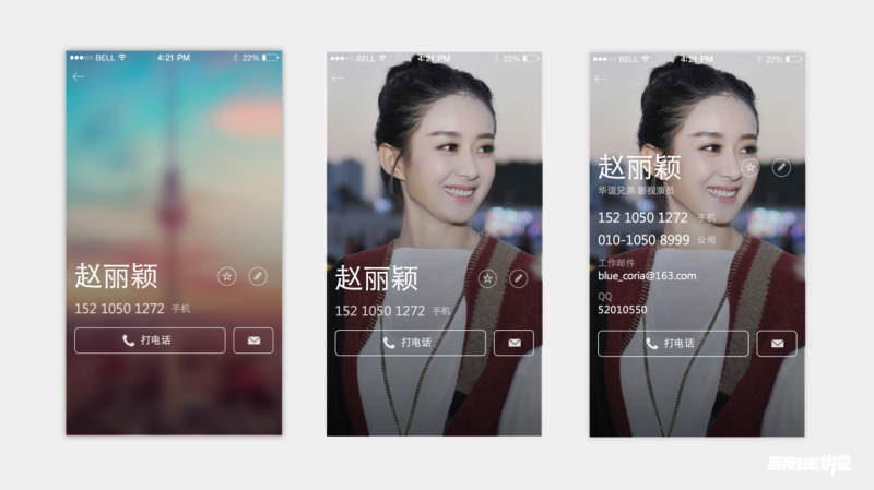 弱化头像区域,采用模糊过的一张好看的图片作为没有设置头像时的默认背景。既然打电话是第一诉求,就用极致的方式,把打电话按钮放大,并且放置在单手最好点击的位置区域。而当用户设置头像后,不再需要裁切成大头照,直接以底图的方式全屏显示。当然,设计总是要考虑边界情况,当用户想设置更多信息时,页面也是可以承载的,内容向上顶,直到高度撑满全屏,底部打电话按钮会悬停在页面最下方。