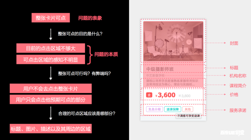 这是我们产品中经常能够见到的卡片设计。现在给大家看到这个卡片是一个课程卡片,它主要分为:封面、标题……。鼠标移上去时,会有一个红框。设计师在设计时设定的点击区域为:点击封面或者是标题,就可以跳转到课程的介绍页。但是,在产品即将上线时,这个项目的经理提出了一个质疑:可点击区域为什么不是整张卡片?