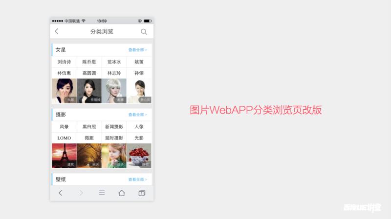 这是百度图片手机WAP站的分类浏览页,现在产品经理提出要进行优化改版。同样的道理,不要急于上手去画图,首先要通过调研分析确定改版目标。