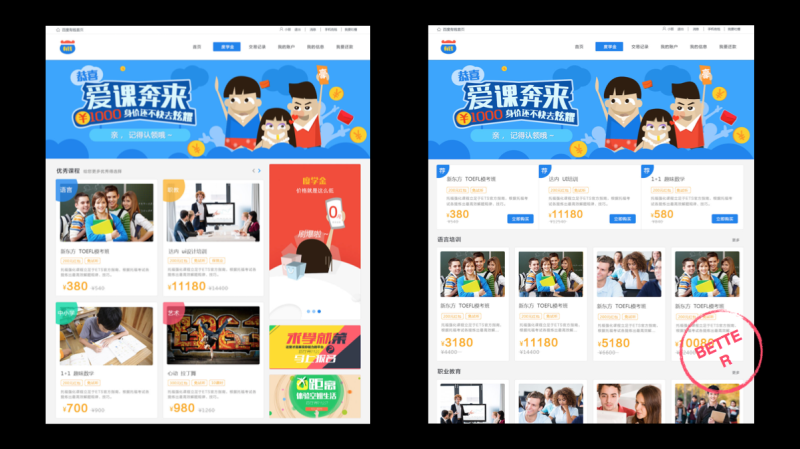 产品在不同阶段对设计的要求也是不一样的,比如这个教育金融贷款的产品在上线初,目的就是要让用户能够快速找到感兴趣的课程,然后进行贷款。方案一较深的入口以及右侧的广告是无法达到这个目标的。所以,右边的方案二是更好的选择。