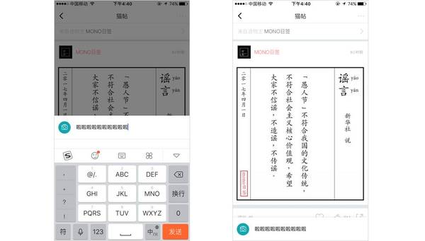 如MONO进行评论,已输入文字,在收起后仍然保留在输入框;MONO在发布日签时,若已输入文字,收起后点击对应区域,该区域的文案仍然保留在输入框中。