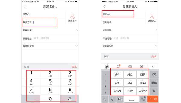 4、判断输入框的内容类型,自动调用对应类型的键盘。如输入短信验证码则调用数字键盘、输入地址则调用拼音键盘。