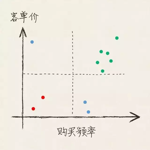 举个例子:假设该图反映了某个消费者分群的结果,横轴代表购买频率,纵轴代表客单价,那么绿色的这群人,就是明显的“人傻钱多”的“剁手金牌客户”。