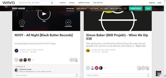 Wavo(https://wavo.me), 音乐/社交媒体网站,提供了一个极好的无限滚动的例子。该网站色调是黑白的,图像是清爽、简单的,它们很好地打破了负空间的每个部分。当用户向下滚动页面时,他们可以很容易地专注于那里的信息,同时仍然沉浸在品牌的美感中。