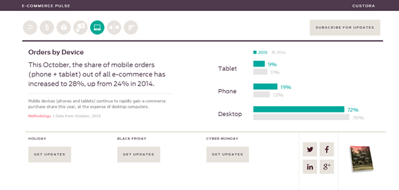 动画图表易于结合,而且看起来有趣。它们给你的网站添加了一小部分的运动来创建一个有趣的信息图表。Custora.com(https://pulse.custora.com/pulse/platform), 是一个分析电子商务趋势的网站,它通过一系列丰富的动画图表展示其数据。