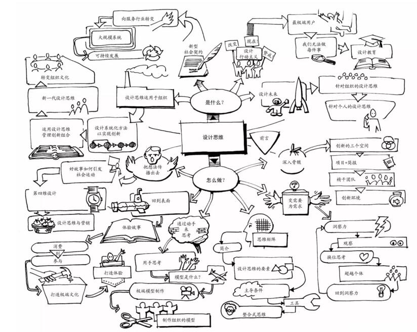 在书籍扉页,作者就露一手「设计思维」的魅力,他摒弃了过往传统目录的束缚,用一张思维导图(Mind Map)系统阐释了设计思维的原理。