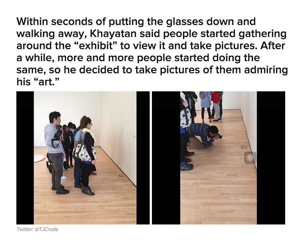 前不久,来自湾区的17岁青年Khayantan在旧金山现代艺术馆(SFMOMA)的地板上放了一副眼镜,观众将他的眼镜当成艺术品,纷纷围观拍照。而这一现象发布后又被社交网络广泛转发传播。