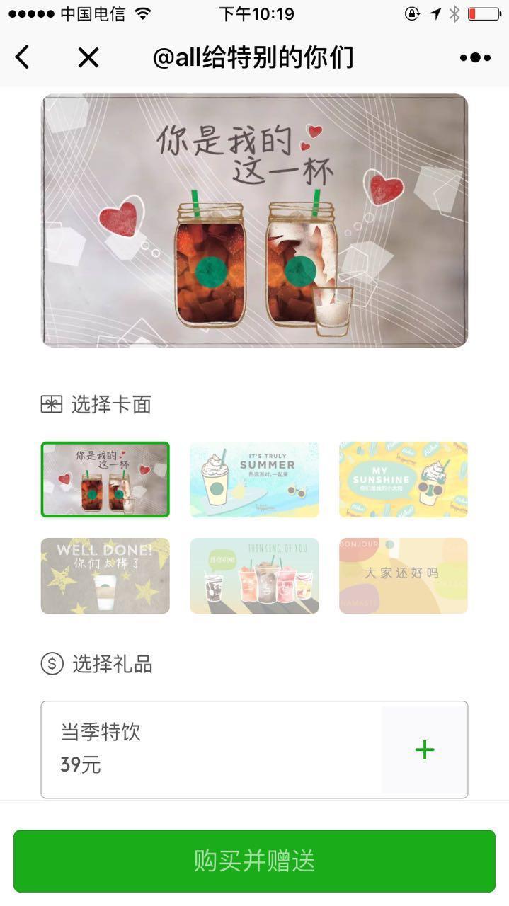这是一个真实的故事:有个老板想请客给员工喝咖啡,给员工钱吧,太少,给不出去。星巴克小程序最前面的功能就是“请朋友喝咖啡”,完美的解决了这个问题,购买完“虚拟卡”,立刻转发给朋友,朋友就可以去领已经付好费的咖啡了。